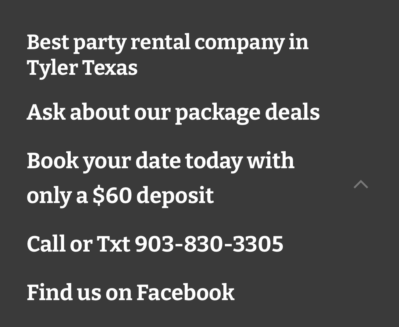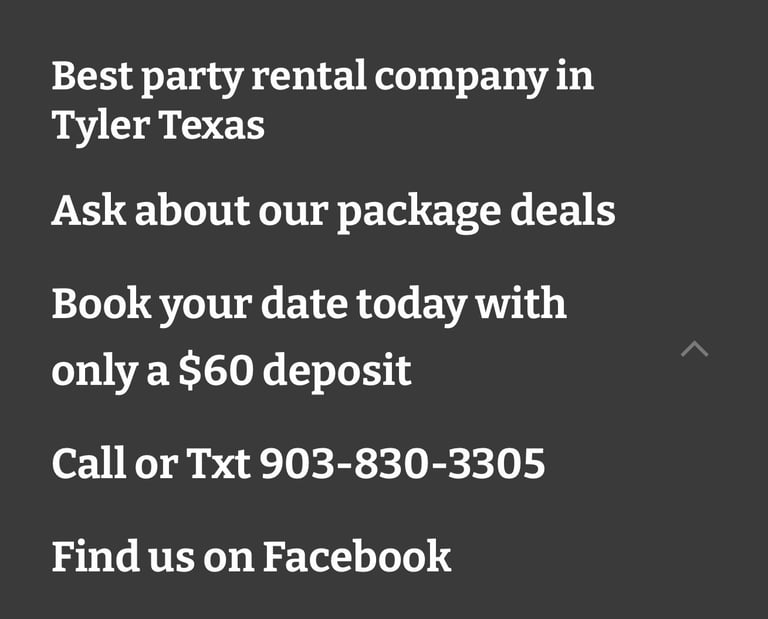 If you're in search of an excellent party rental service, look no further! Esparzas party rentals has you covered with a variety of party package options. Get your waterslides, bounce houses, sports games, obstacle courses, and tables/chairs all at an amazing price. Hablamos español.
