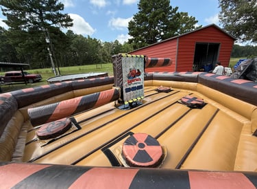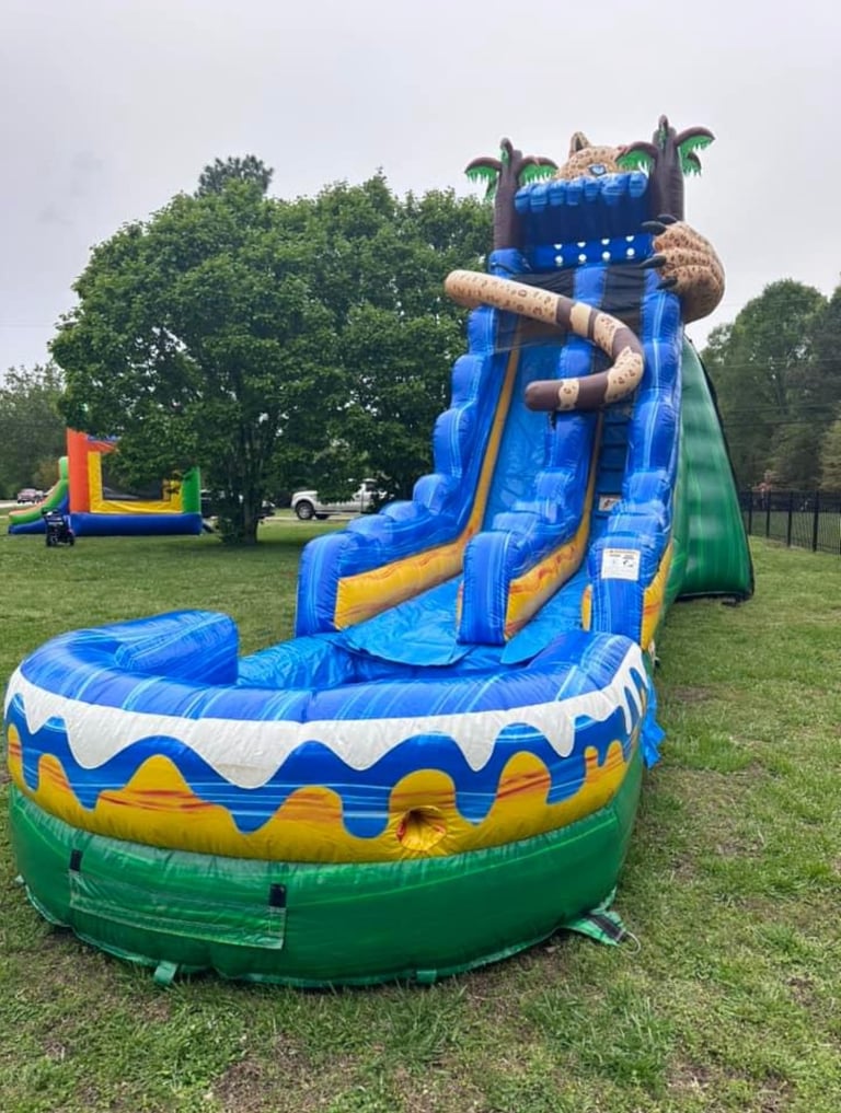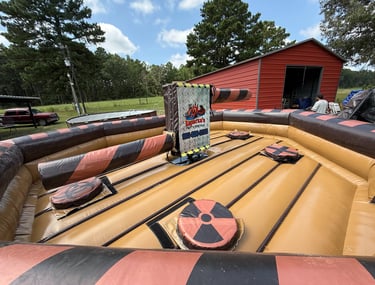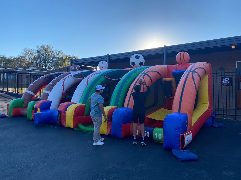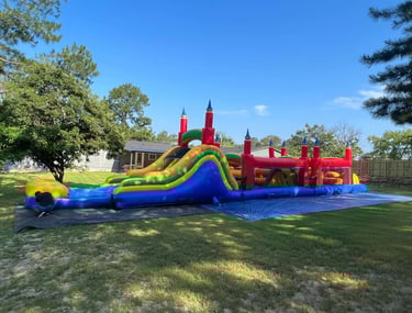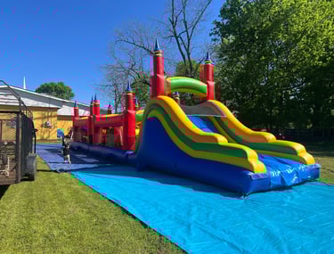 This inflatable obstacle course spans an impressive 70 feet and can be utilized in wet or dry conditions. We supply tarps and extension cords for all units. A spacious yard is essential as this obstacle course requires three blowers.